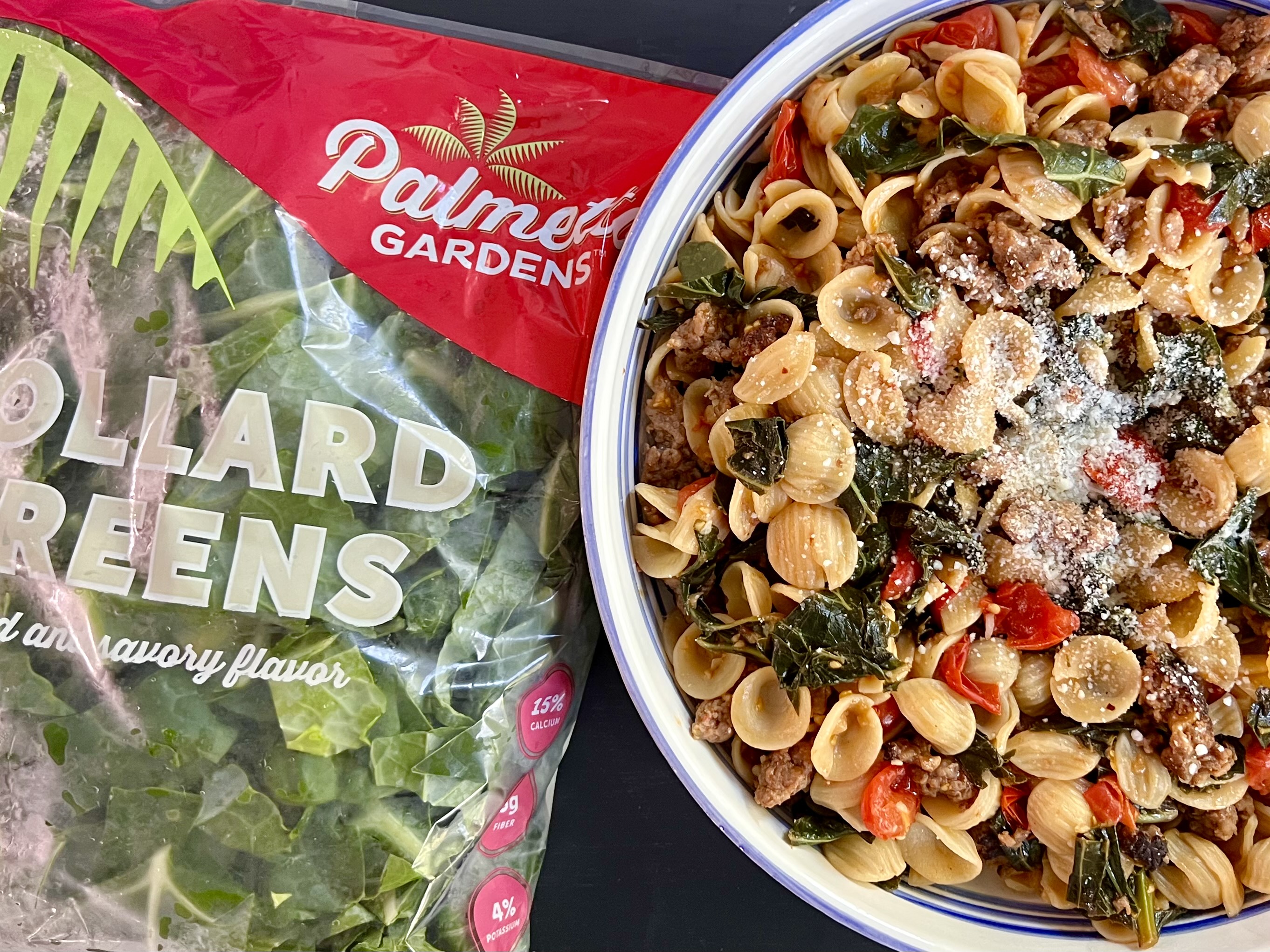 3. Add the collard greens and minced garlic to the pan, stirring to coat them with pan drippings from the sausage. Add the sherry (or wine or broth) to the pan, scraping up any brown bits. Set the heat to medium-low and place a lid on the pan so that the collards will steam and braise in the sherry. Stir occasionally adding more liquid if necessary. Once the collards are tender, add the halved cherry tomatoes and stir until they release their liquid and soften a bit.