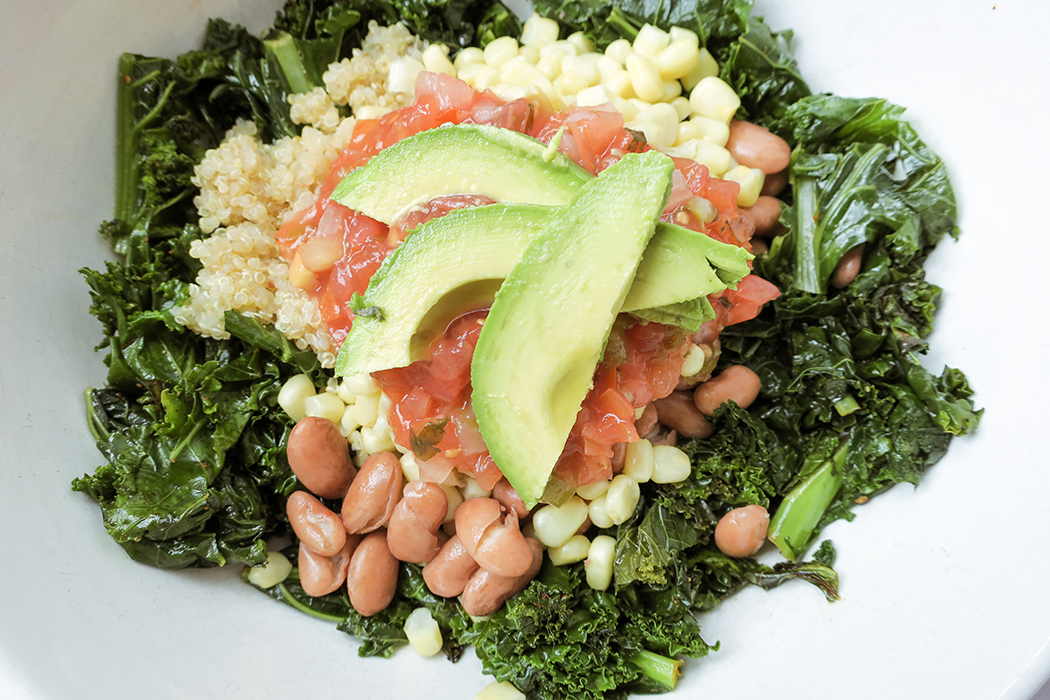 - Assemble each bowl adding equal amounts of each ingredient starting with the cooked kale, followed by the cooked quinoa, pinto beans, and corn. Finally top with 1/4 cup fresh salsa and 3 slices of avocado and serve.