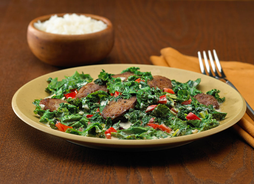 In a large saucepan, sauté garlic, red bell pepper, onions, and sausage in olive oil. In a medium pot, add vegetable stock, sugar, salt and pepper and bring to a boil. Add greens and bring to a boil again. Lower heat to medium, cover pot and cook for 35 minutes. Add sautéed mixture and half-and-half. Stir and simmer 10 minutes.